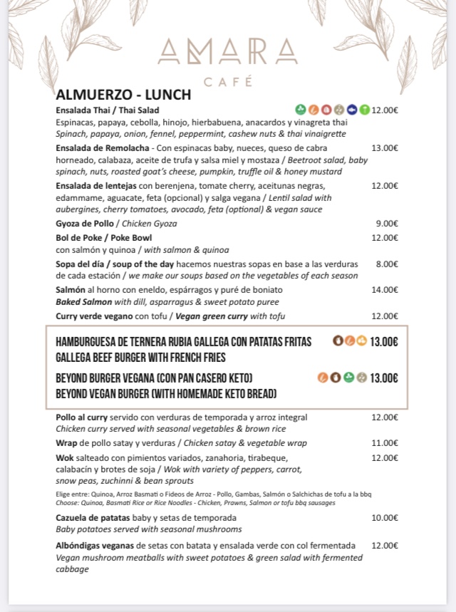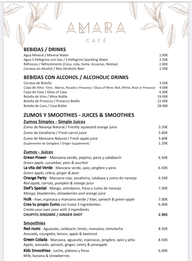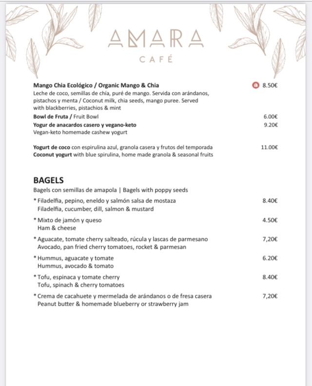 Welcome to Amara Café, nestled in the serene streets of Urbanizacion El Marques, Estepona. A haven for breakfast and lunch lovers, Amara Café offers a menu that celebrates fresh and healthy ingredients. Highlights include their Amara Benedict, featuring poached eggs topped with rich hollandaise sauce served alongside salmon and crispy kale chips, a dish sure to satisfy any palate at €13.00. The Special Omelet is a delightful blend of ham, cheese, spinach, and onions, while the Keto Breakfast caters to health enthusiasts with its inventive combinations.